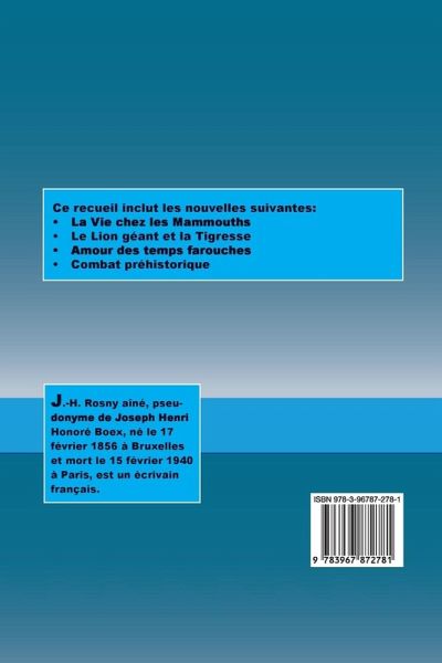 Ce recueil inclut les nouvelles suivantes: (1) La Vie chez les Mammouths (2) Le Lion géant et la Tigresse (3) Amour des temps farouches (4) Combat préhistorique Elles décrivent des combats féroces, des troupeaux ou des meutes, une nature neuve et indomptée, des lacs, des îles et des cavernes rougies...