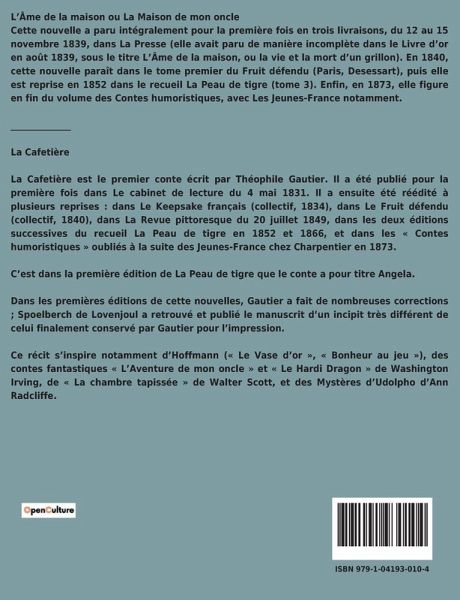 L¿Âme de la maison ou La Maison de mon oncle Cette nouvelle a paru intégralement pour la première fois en trois livraisons, du 12 au 15 novembre 1839, dans La Presse (elle avait paru de manière incomplète dans le Livre d¿or en août 1839, sous le titre L¿Âme de la maison, ou la vie et la mort d¿un grillon). En 1840, cette nouvelle paraît dans le tome premier du Fruit défendu (Paris, Desessart), puis elle est reprise en 1852 dans le recueil La Peau de tigre (tome 3). Enfin, en 1873, elle figure en fin du volume des Contes humoristiques, avec Les Jeunes-France notamment. ______________ La Cafetière La Cafetière est le premier conte écrit par Théophile Gautier. Il a été publié pour la première fois dans Le cabinet de lecture du 4 mai 1831. Il a ensuite été réédité à plusieurs reprises : dans Le Keepsake français (collectif, 1834), dans Le Fruit défendu (collectif, 1840), dans La Revue pittoresque du 20 juillet 1849, dans les deux éditions successives du recueil La Peau de tigre en 1852 et 1866, et dans les « Contes humoristiques » oubliés à la suite des Jeunes-France chez Charpentier en 1873. C¿est dans la première édition de La Peau de tigre que le conte a pour titre Angela. Dans les premières éditions de cette nouvelles, Gautier a fait de nombreuses corrections ; Spoelberch de Lovenjoul a retrouvé et publié le manuscrit d¿un incipit très différent de celui finalement conservé par Gautier pour l¿impression. Ce récit s¿inspire notamment d¿Hoffmann (« Le Vase d¿or », « Bonheur au jeu »), des contes fantastiques « L¿Aventure de mon oncle » et « Le Hardi Dragon » de Washington Irving, de « La chambre tapissée » de Walter Scott, et des Mystères d¿Udolpho d¿Ann Radcliffe.