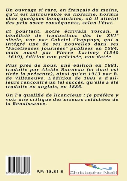 Un ouvrage si rare, en français du moins, qu'il est introuvable en librairie, hormis chez quelques bouquinistes, où il atteint des prix assez conséquents, selon l'état. Et pourtant, Firenzuola a bénéficié de traductions dès le XVI° siècle, une par Gabriel Chappuys, qui a intégré une de ses nouvelles dans ses "Facétieuses Journées" publiées en 1584, mais aussi par Pierre Larivey (1540-1619), édition non précisée, non datée.Plus près de nous, une édition en 1881, traduite par Alcide Bonneau (et dont est tirée la présente), ainsi qu'en 1913 par B. de Villeneuve. L'édition de 1881 a d'ailleurs rencontré un tel succès, qu'elle a été traduite en anglais, en 1886.On l'a qualifié de licencieux ; je préfère y voir une critique des moeurs relâchées de la Renaissance.