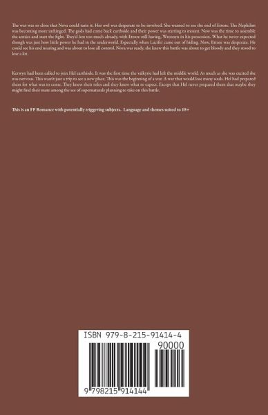 The war was so close that Nova could taste it. Her owl was desperate to be involved. She wanted to see the end of Ettore. The Nephilim was becoming more unhinged. The gods had come back earthside and their power was starting to mount. Now was the time to assemble the armies and start the fight. They'd lost too much already, with Ettore still having, Wrennyn in his possession. What he never expected though was just how little power he had in the underworld. Especially when Lucifer came out of hiding. Now, Ettore was desperate. He could see his end nearing and was about to lose all control. Nova was ready, she knew this battle was about to get bloody and they stood to lose a lot. Kerwyn had been called to join Hel earthisde. It was the first time the valkyrie had left the middle world. As much as she was excited she was nervous. This wasn't just a trip to see a new place. This was the beginning of a war. A war that would lose many souls. Hel had prepared them for what was to come. They knew their roles and they knew what to expect. Except that Hel never prepared them that maybe they might find their mate among the see of supernaturals planning to take on this battle. This is an FF Romance with potentially triggering subjects. Language and themes suited to 18+