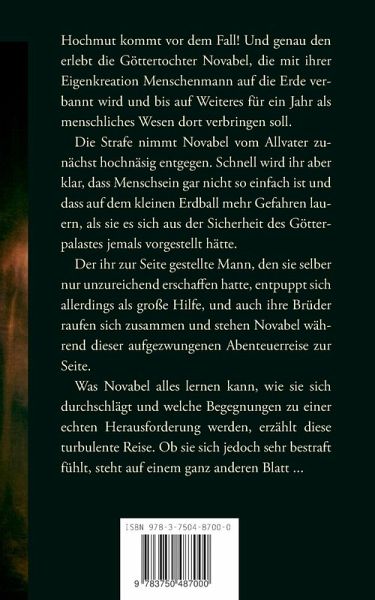 Hochmut kommt vor dem Fall! Und genau den erlebt die Göttertochter Novabel, die mit ihrer Eigenkreation Menschenmann auf die Erde verbannt wird und bis auf Weiteres für ein Jahr als menschliches Wesen dort verbringen soll.Die Strafe nimmt Novabel vom Allvater zunächst hochnäsig entgegen. Schnell wird ihr aber klar, dass Menschsein gar nicht so einfach ist und dass auf dem kleinen Erdball mehr Gefahren lauern, als sie es sich aus der Sicherheit des Götterpalastes jemals vorgestellt hätte.Der ihr zur Seite gestellte Mann, den sie selber nur unzureichend erschaffen hatte, entpuppt sich allerdings als große Hilfe, und auch ihre Brüder raufen sich zusammen und stehen Novabel während dieser aufgezwungenen Abenteuerreise zur Seite.Was Novabel alles lernen kann, wie sie sich durchschlägt und welche Begegnungen zu einer echten Herausforderung werden, erzählt diese turbulente Reise. Ob sie sich jedoch sehr bestraft fühlt, steht auf einem ganz anderen Blatt ...
