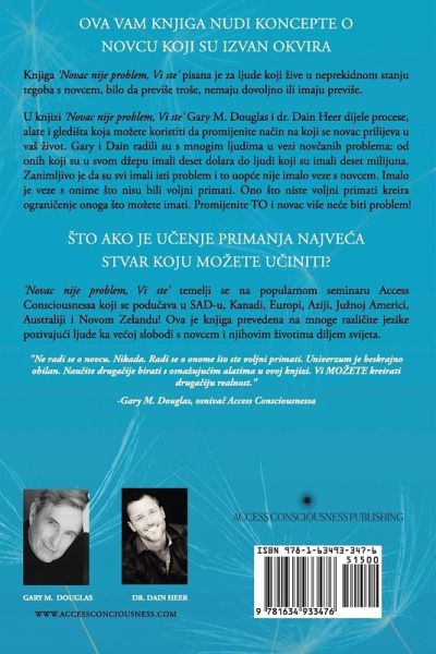 OVA VAM KNJIGA NUDI KONCEPTE O NOVCU KOJI SU IZVAN OKVIRA Knjiga 'Novac nije problem, Vi ste' pisana je za ljude koji ive u neprekidnom stanju tegoba s novcem, bilo da previše troše, nemaju dovoljno ili imaju previše. U knjizi 'Novac nije problem, Vi ste' Gary M. Douglas i dr. Dain Heer dijele procese, alate i gledišta koja moete koristiti da promijenite näin na koji se novac prilijeva u vaš ivot. Gary i Dain radili su s mnogim ljudima u vezi nov¿anih problema: od onih koji su u svom depu imali deset dolara do ljudi koji su imali deset milijuna. Zanimljivo je da su svi imali isti problem i to uop¿e nije imalo veze s novcem. Imalo je veze s onime što nisu bili voljni primati. Ono što niste voljni primati kreira ograni¿enje onoga što moete imati. Promijenite TO i novac više ne¿e biti problem! ŠTO AKO JE U¿ENJE PRIMANJA NAJVE¿A STVAR KOJU MOETE U¿INITI? 'Novac nije problem, Vi ste' temelji se na popularnom seminaru Access Consciousnessa koji se podüava u SAD-u, Kanadi, Europi, Aziji, Junoj Americi, Australiji i Novom Zelandu! Ova je knjiga prevedena na mnoge razli¿ite jezike pozivajüi ljude ka ve¿oj slobodi s novcem i njihovim ivotima diljem svijeta. "Ne radi se o novcu. Nikada. Radi se o onome što ste voljni primati. Univerzum je beskrajno obilan. Naüite drugäije birati s osnaujüim alatima u ovoj knjizi. Vi MOETE kreirati drugäiju realnost." -Gary M. Douglas, osnivä Access Consciousnessa