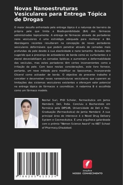 O maior desafio enfrentado pela entrega tópica é a natureza de barreira da própria pele que limita a Biodisponibilidade (BA) dos fármacos administrados topicamente. A entrega de fármacos através de portadores nano vesiculares é uma estratégia adequada para melhorar a BA. Abordagens recentes resultaram na concepção de novos portadores vesiculares deformáveis que podem penetrar através de camadas mais profundas da pele devido à sua elasticidade e nano tamanho. Estudos têm sugerido que a presença de activadores de borda como os surfactantes e o etanol desestabilizam as camadas lipídicas e aumentam a deformabilidade das vesículas, mas estes portadores têm certos inconvenientes como a irritação da pele. Com base nestas considerações, este livro fornece, portanto, um novo método para modificar os lipossomas, incorporando Glicerol como activador de borda. O objectivo do presente trabalho é conceber e desenvolver novas nanoestruturas vesiculares que superem as limitações dos sistemas vesiculares existentes e ofereçam valor potencial na entrega tópica de fármacos e cosméticos. A rodamina B é escolhida como um fármaco modelo.