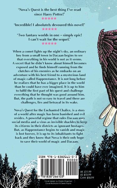 When a comet lights up the night's sky, an ordinary boy from a small town in Dacaan begins to see that everything in his world is not as it seems. A secret that he didn't know about himself becomes exposed and he finds himself running from the clutches of his enemies as he embarks on an adventure with his best friend to a mysterious land of magic called Happenstance. It is not long before he realizes that he has a bigger place in the world than he could have ever imagined. It is up to him to fulfil his new quest and challenge everything that he thought was good around him. But, the path is not so easy to travel and there are challenges, lies and betrayal in its wake. Nova's Quest for the Enchanted Chalice, is a story of a world after magic has been banished and evil resides. A powerful regime that rules Dacaan uses social media, a virus and other invisible shackles to keep its citizens in their districts as ignorant hostages. But, as Happenstance begins to vanish and magic is lost forever, it is up to its inhabitants to fight back and they know that Nova is their only hope to save their world of magic and Dacaan.