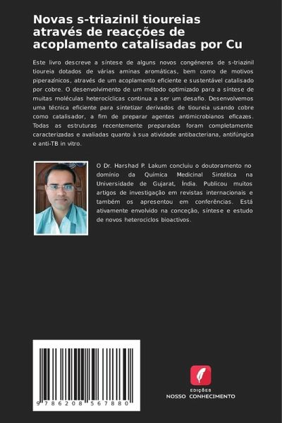 Este livro descreve a síntese de alguns novos congéneres de s-triazinil tioureia dotados de várias aminas aromáticas, bem como de motivos piperazínicos, através de um acoplamento eficiente e sustentável catalisado por cobre. O desenvolvimento de um método optimizado para a síntese de muitas moléculas heterocíclicas continua a ser um desafio. Desenvolvemos uma técnica eficiente para sintetizar derivados de tioureia usando cobre como catalisador, a fim de preparar agentes antimicrobianos eficazes. Todas as estruturas recentemente preparadas foram completamente caracterizadas e avaliadas quanto à sua atividade antibacteriana, antifúngica e anti-TB in vitro.