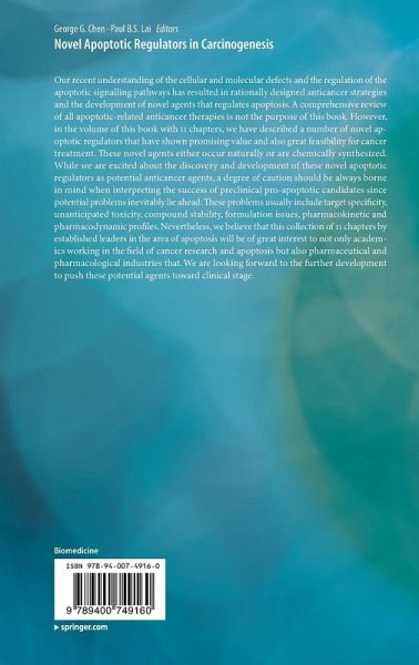 Our recent understanding of the cellular and molecular defects and the regulation of the apoptotic signalling pathways has resulted in rationally designed anticancer strategies and the development of novel agents that regulates apoptosis. A comprehensive review of all apoptotic-related anticancer therapies is not the purpose of this book. However, in the volume of this book with 11 chapters, we have described a number of novel apoptotic regulators that have shown promising value and also great feasibility for cancer treatment. These novel agents either occur naturally or are chemically synthesized. While we are excited about the discovery and development of these novel apoptotic regulators as potential anticancer agents, a degree of caution should be always borne in mind when interpreting the success of preclinical pro-apoptotic candidates since potential problems inevitably lie ahead. These problems usually include target specificity, unanticipated toxicity, compound stability, formulation issues, pharmacokinetic and pharmacodynamic profiles. Nevertheless, we believe that this collection of 11 chapters by established leaders in the area of apoptosis will be of great interest to not only academics working in the field of cancer research and apoptosis but also pharmaceutical and pharmacological industries that . We are looking forward to the further development to push these potential agents toward clinical stage.