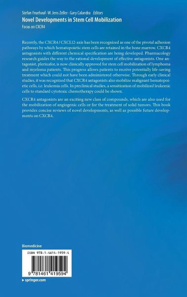 Preface.- Preclinical Experience with AMD3100 for Mobilization of Hematopoietic Stem and Progenitor Cells.- Molecular Pharmacology of CXCR4 Inhibition.- Combination Strategies for Stem Cell Mobilization Targeting CXCR4 and S1P Receptors.- Should We Stay Or Should We Go Now? Cell Adhesion and Mobilization Pathways of Hematopoietic Cellls.- Role of the CXCR4/CXCL12 Axis in Hematopoietic Stem Cell Trafficking.- Early Studies of AMD3100/Plerixafor in Healthy Volunteers.- The Current Role of Plerixafor in Stem Cell Mobilization for Hematopoietic Stem Cell Transplantation.- Relevance and Clinical Implications of Tumor Cell Mobilization in Autologous Transplantation of Multiple Myeloma and non Hodgkin's lymphoma.- Plerixafor - Data from the Compassionate Use Program.- Stem Cell Mobilization with Chemomobilization plus Plerixafor in Hard-To-Mobilize Patients - The Experience at Kuopio University Hospital, Finland.- Blood Stem Cell Mobilization in Solid Tumors - Experience with Plerixafor and Alternative Ways of Hematopoietic Stem Cell Mobilization.- Mobilization with Chemotherapy+G-CSF+Plerixafor in Europe- the Italian experience.- Experience with Plerixafor in Poor Mobilizers.- CXCR4 Antagonists.- Application of CXCR4-Inhibitors in Leukemia.- CXCR4 Antagonists for the Treatment of CML.- Targeting CXCR4 in Chronic Lymphocytic Leukemia (CLL): Preclinical Rationale and Early Clinical Experience.- CXCR4-Blockade for Treatment of Breast Cancer.- Molecular Imaging of CXCR4 Receptor Expression in Tumors.- Potential Use of CXCR4 Antagonists to Mobilize Endothelial and Mesenchymal Stem Cells.- Strategies to Enhance Hematopoietic Stem Cell Engraftment Following Transplantation.- Mobilization for Gene Therapy.- Index.