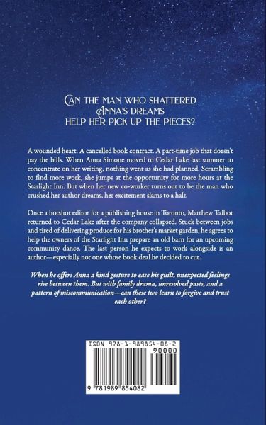 Can the man who shattered Anna's dreams help her pick up the pieces? A wounded heart. A cancelled book contract. A part-time job that doesn't pay the bills. When Anna Simone moved to Cedar Lake last summer to concentrate on her writing, nothing went as she had planned. Scrambling to find more work, she jumps at the opportunity for more hours at the Starlight Inn. But when her new co-worker turns out to be the man who crushed her author dreams, her excitement slams to a halt. Once a hotshot editor for a publishing house in Toronto, Matthew Talbot returned to Cedar Lake after the company collapsed. Stuck between jobs and tired of delivering produce for his brother's market garden, he agrees to help the owners of the Starlight Inn prepare an old barn for an upcoming community dance. The last person he expects to work alongside is an author-especially not one whose book deal he decided to cut. When he offers Anna a kind gesture to ease his guilt, unexpected feelings rise between them. But with family drama, unresolved pasts, and a pattern of miscommunication-can these two learn to forgive and trust each other? If you love small towns and second chances, this series is for you!