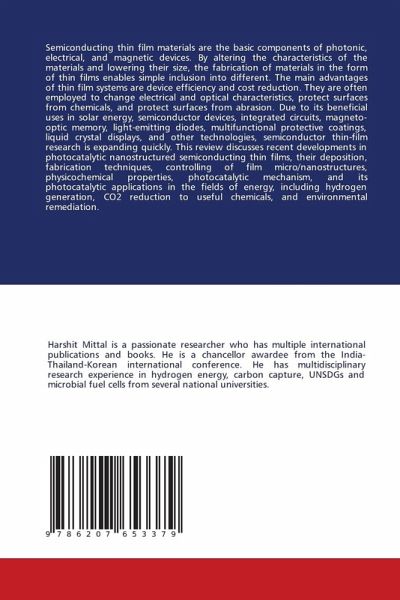 Semiconducting thin film materials are the basic components of photonic, electrical, and magnetic devices. By altering the characteristics of the materials and lowering their size, the fabrication of materials in the form of thin films enables simple inclusion into different. The main advantages of thin film systems are device efficiency and cost reduction. They are often employed to change electrical and optical characteristics, protect surfaces from chemicals, and protect surfaces from abrasion. Due to its beneficial uses in solar energy, semiconductor devices, integrated circuits, magneto-optic memory, light-emitting diodes, multifunctional protective coatings, liquid crystal displays, and other technologies, semiconductor thin-film research is expanding quickly. This review discusses recent developments in photocatalytic nanostructured semiconducting thin films, their deposition, fabrication techniques, controlling of film micro/nanostructures, physicochemical properties, photocatalytic mechanism, and its photocatalytic applications in the fields of energy, including hydrogen generation, CO2 reduction to useful chemicals, and environmental remediation.