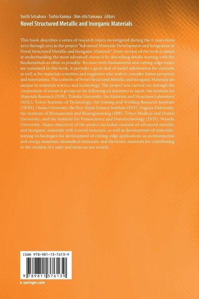 This book describes a series of research topics investigated during the 6 years from 2010 through 2015 in the project "Advanced Materials Development and Integration of Novel Structured Metallic and Inorganic Materials". Every section of the book is aimed at understanding the most advanced research by describing details starting with the fundamentals as often as possible. Because both fundamental and cutting-edge topics are contained in this book, it provides a great deal of useful information for chemists as well as for materials scientists and engineers who wish to consider future prospects and innovations. The contents of Novel Structured Metallic and Inorganic Materials are unique in materials science and technology.