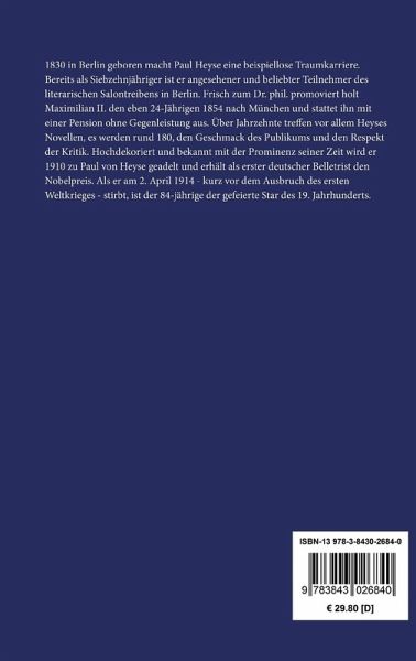 Paul Heyse: Novellen vom Gardasee Erstdruck: J. G. Cottäsche Buchhandlung Nachfolger G. m. b. H. Stuttgart und Berlin 1902 Inhaltsverzeichnis Novellen vom Gardasee Gefangene Singvögel Die Macht der Stunde San Vigilio Entsagende Liebe Eine venezianische Nacht Antiquarische Briefe Biographie Neuausgabe mit einer Biographie des Autors. Herausgegeben von Karl-Maria Guth. Berlin 2018. Umschlaggestaltung von Thomas Schultz-Overhage unter Verwendung des Bildes: Franz Richard Unterberger, Am Gardasee, um 1870. Gesetzt aus der Minion Pro, 11 pt. Über den Autor: 1830 in Berlin geboren macht Paul Heyse eine beispiellose Traumkarriere. Bereits als Siebzehnjähriger ist er angesehener und beliebter Teilnehmer des literarischen Salontreibens in Berlin. Frisch zum Dr. phil. promoviert holt Maximilian II. den eben 24-Jährigen 1854 nach München und stattet ihn mit einer Pension ohne Gegenleistung aus. Über Jahrzehnte treffen vor allem Heyses Novellen, es werden rund 180, den Geschmack des Publikums und den Respekt der Kritik. Hochdekoriert und bekannt mit der Prominenz seiner Zeit wird er 1910 zu Paul von Heyse geadelt und erhält als erster deutscher Belletrist den Nobelpreis. Als er am 2. April 1914 - kurz vor dem Ausbruch des ersten Weltkrieges - stirbt, ist der 84-jährige der gefeierte Star des 19. Jahrhunderts.