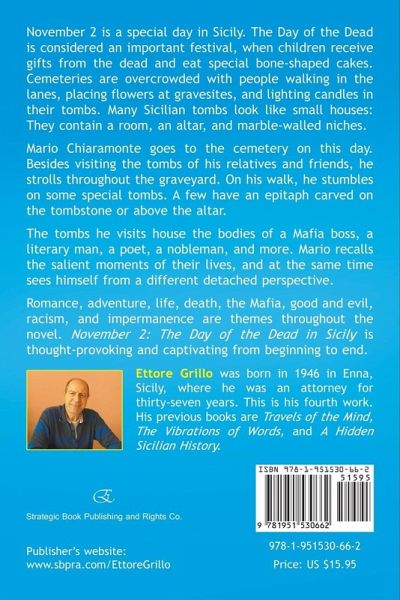 November 2 is a special day in Sicily. The Day of the Dead is considered an important festival, when children receive gifts from the dead and eat special bone-shaped cakes. Cemeteries are overcrowded with people walking in the lanes, placing flowers at gravesites, and lighting candles in their tombs. Many Sicilian tombs look like small houses: They contain a room, an altar, and marble-walled niches. Mario Chiaramonte goes to the cemetery on this day. Besides visiting the tombs of his relatives and friends, he strolls throughout the graveyard. On his walk, he stumbles on some special tombs. A few have an epitaph carved on the tombstone or above the altar. The tombs he visits house the bodies of a Mafia boss, a literary man, a poet, a nobleman, and more. Mario recalls the salient moments of their lives, and at the same time sees himself from a different detached perspective. Romance, adventure, life, death, the Mafia, good and evil, racism, and impermanence are themes throughout the novel. November 2: The Day of the Dead in Sicily is thought-provoking and captivating from beginning to end. Author Bio: Ettore Grillo was born in 1946 in Enna, Sicily, where he was an attorney for thirty-seven years. This is his fourth work. His previous books are Travels of the Mind, The Vibrations of Words, and A Hidden Sicilian History.