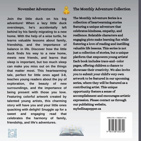 Join the little duck on his big adventure! When a lazy little duck oversleeps, he's accidentally left behind by his family migrating to a new home. With the help of a wise turtle, he learns valuable lessons about family, friendship, and the importance of balance in life. Discover how the little duck finds his way to a new home, meets new friends, and learns that sleep is important, but too much sleep can make you miss out on the things that matter most. This heartwarming tale, perfect for little ones aged 3-8, teaches young readers about the joy of exploration, the beauty of new surroundings, and the importance of being present with those you love. Featuring colorful artwork created by talented young artists, this charming story will have you and your little ones quacking with delight! Snuggle up for a sweet and engaging read that celebrates the harmony of family, friendship, and life's adventures. Part of the Monthly Adventure Series: A collection of uplifting stories that foster kindness, empathy, and resilience. Each book features relatable characters, engaging plots, trace-and-color pages, and valuable life lessons, making them perfect for early readers and story time sessions. Available in English, French and Spanish!