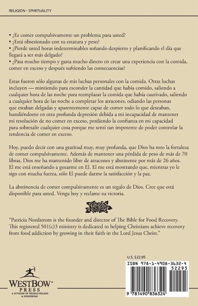 ¿Es comer compulsivamente un problema para usted? ¿Está obsesionado con su estatura y peso? ¿Pierde usted horas indeterminables soñando despierto y planificando el día que llegará a ser más delgado? ¿Pasa mucho tiempo y gasta mucho dinero en crear una experiencia con la comida, comer en exceso y después sufriendo las consecuencias? Estas fueron sólo algunas de mis luchas personales con la comida. Otras luchas incluyen ? mintiendo para esconder la cantidad que había comido, saliendo a cualquier hora de las noche para reemplazar la comida que había cautivado, saliendo a cualquier hora de las noche a completar los atracones, odiando las personas que estaban delgadas y aparentemente capaz de comer todo lo que deseaban, hundiéndome en otra profunda depresión debida a mi incapacidad de mantener mi resolución de no comer en exceso, perdiendo la confianza en mi capacidad para sobresalir cualquier cosa porque me sentí tan impotente de poder controlar la tendencia de comer en exceso. Hoy, puedo decir con una gratitud muy, muy profunda, que Dios ha roto la fortaleza de comer compulsivamente. Además de mantener una pérdida de peso de más de 70 libras, Dios me ha mantenido libre de atracones y abstinente por más de 26 años. El me está enseñando a gozarme en El. El me está mostrando que, mientras yo le sigo con mucha fuerza, sólo El puede darme la satisfacción y la paz. La abstinencia de comer compulsivamente es un regalo de Dios. Cree que está disponible para usted. Venga hoy y reclame su victoria.