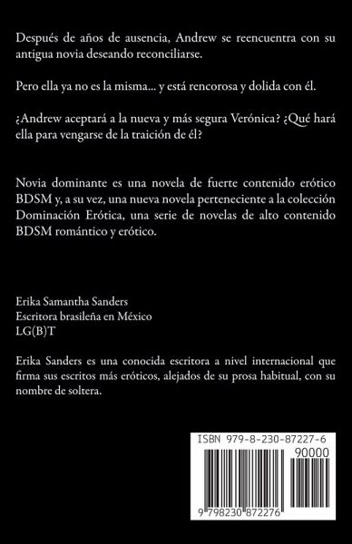 Después de años de ausencia, Andrew se reencuentra con su antigua novia deseando reconciliarse. Pero ella ya no es la misma... y está rencorosa y dolida con él. ¿Andrew aceptará a la nueva y más segura Verónica? ¿Qué hará ella para vengarse de la traición de él? Novia dominante es una novela de fuerte contenido erótico BDSM y, a su vez, una nueva novela perteneciente a la colección Dominación Erótica, una serie de novelas de alto contenido BDSM romántico y erótico.