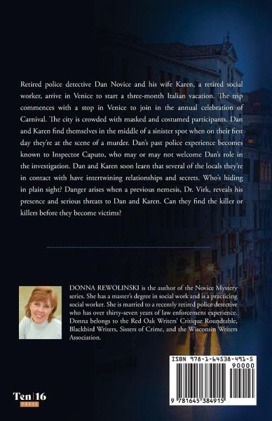 Retired police detective Dan Novice and his wife Karen, a retired social worker, arrive in Venice to start a three-month Italian vacation. The trip commences with a stop in Venice to join in the annual celebration of Carnival. The city is crowded with masked and costumed participants. Dan and Karen find themselves in the middle of a sinister spot when on their first day they're at the scene of a murder. Dan's past police experience becomes known to Inspector Caputo, who may or may not welcome Dan's role in the investigation. Dan and Karen soon learn that several of the locals they're in contact with have intertwining relationships and secrets. Who's hiding in plain sight? Danger arises when a previous nemesis, Dr. Virk, reveals his presence and serious threats to Dan and Karen. Can they find the killer or killers before they become victims?