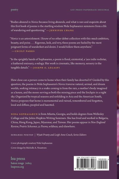 How close can a person come to home when their family has deserted it? Guided by this question, the poems in Nida Sophasarun's Novice traverse natural, animal, and dream worlds, seeking intimacy in a snake coming in from the rain, a mother's body imagined as a house, and the moon serving as both the missing piece and the linchpin in a night sky. Organized by tropical seasons and unfolding in Asia and the American South, Novice proposes that home is monumental and ruined, remembered and forgotten, local and diffuse, peopled and haunted.