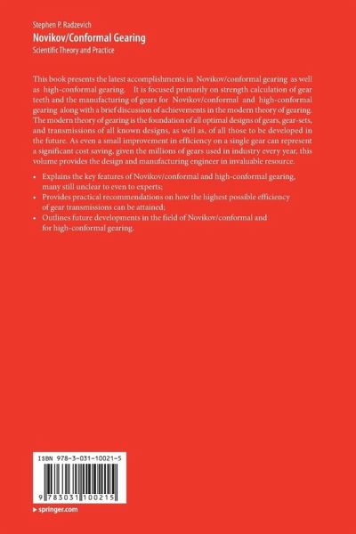 High-Conformal Gearing: A New Look at the Concept of Novikov Gearing (The Key Features of Novikov Gearing).- Meshing Theory for Abnormal Novikov Helical Gears.- Helical Bevel Novikov Gears.- Optimization of Novikov Gearing by Means of Specific Load Capacity Criterion.- Modern Methods of Estimating and Increasing the Load-Bearing Capacity of Novikov Gearing.- Some Features of the Contact Strength of Novikov Gearing.- Tooth Relieving of Hobs for Cutting Novikov Gears with Double Lines of Action.- About the Priority of M.L. Novikov in the Development of Novikov Gear System.- Prediction, Control, and Management, of Gear Manufacturing Accuracy.- Main Representations, Models and Software of Gear Trains as a Basis for Creating their Digital Twins.- Elliptical Gear Drives.- On the Lack of Understanding of the Scientific Theory of Gearing by the Majority of Gear Scientists and Engineers.- Recent Accomplishments in Novikov/Conformal Gearing: Theory, Design, Production, Inspection,and Application (Review).- Bibliography on Novikov Gear System.- Appendices.