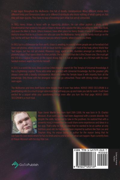 A war rages throughout the Multiverse. One full of deadly consequences. Many different stories from different times and Dimensions takes us to different individuals who know nothing of what's going on. But they will learn quickly. They have no way of knowing each other, but are all connected. In 1953, Henry Brown is faced with an Agonizing decision. He can either publish a photo of the Extraterrestrial that landed in his yard or listen to those who oppose the idea, including his Wife, Blue Book, and even the Men In Black. Others however, have other plans for Henry Brown. A force of Celestials allow Henry to know that he is a chosen one who can save the Multiverse. Henry and his family must go on the run, but he will learn that the universe has you where it wants, when it wants you there. In 1953, but in a dimension far from earth, chaos is awaiting. In a world where people are on horseback but have cell phones, where racism is still an issue but the Caucasians get most of the heat, where World War Two began, but has not yet ended, Rhiannon Legg, agent of MI6, stumbles amongst an Infinity-Orb. A powerful object that opens doors to other portals. She is then told that she is the Chosen one. She must get the Orb to a magical Pyramid on the island sKoog. But it is not an easy task, as a hit-man with his own twisted motives, wants the Orb for himself. In 2021, in a world like ours, Brian and Joe Critten travel in search for The Temple of Universal Knowledge. It has a frightening Legend. Those who enter are granted with Universal Knowledge. But the greatest gifts always come with a deadly consequence. Most who enter the Temple leave it with insanity from all the knowledge. Only those with the strongest minds can go untouched. Those with strong minds, are never seen again. The Multiverse and time itself faces more trouble than it ever has before. NOVUS ORDO SECLORUM is a breathtaking intro to a much longer adventure that will keep you up and make you late for work. It will have excited for a sequel while your questioning things even after you turn the final page. NOVUS ORDO SECLORUM is a must read.
