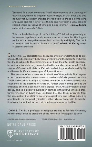 Building on the insights of the ressourcement theology of grace, this sophisticated theological aesthetics offers a fresh vision of the doctrine of creation through a consideration of the beauty of time. Conventional eschatological accounts of life after death tend to emphasize the discontinuity between earthly life and the hereafter: whereas this life is subject to the contingencies of time, life after death is characterized by a stolid eternity. In contrast to this standard view, John E. Thiel's Now and Forever articulates a Catholic eschatology in which earthly life and heavenly life are seen as gracefully continuous. This account offers a reconceptualization of time, which, Thiel argues, is best understood as the sacramental medium of God's grace to creation. Thiel's project thus attempts to rescue time from its Platonically negative resonance in the doctrine of creation. Rather than viewing time as the ambiance of sinful dissolution, Thiel argues for a Christian vision of time's beauty, and so explicitly develops an aesthetics that views time as a creaturely reflection of God's own Trinitarian life. This thesis proceeds from the assumption that all time is eschatological time and is thus guided by attention to the temporality implicit in the virtue of hope, with its orientation toward a fulfilled future that culminates in resurrected life. This interpretation of the beauty of eschatological time in its widest expanse presses further the insight of ressourcement theology that grace is everywhere, while appreciating how time's graceful beauty manifests itself in the diversity of temporal moments, human communities, and most fully in the heavenly communion of the saints.