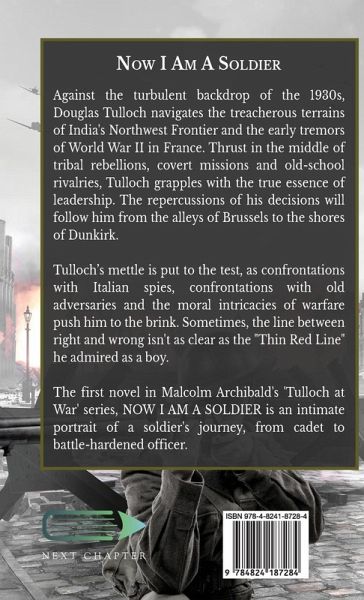 Against the turbulent backdrop of the 1930s, Douglas Tulloch navigates the treacherous terrains of India's Northwest Frontier and the early tremors of World War II in France. Thrust in the middle of tribal rebellions, covert missions and old-school rivalries, Tulloch grapples with the true essence of leadership. The repercussions of his decisions will follow him from the alleys of Brussels to the shores of Dunkirk. Tulloch's mettle is put to the test, as confrontations with Italian spies, confrontations with old adversaries and the moral intricacies of warfare push him to the brink. Sometimes, the line between right and wrong isn't as clear as the "Thin Red Line" he admired as a boy. The first novel in Malcolm Archibald's 'Tulloch at War' series, NOW I AM A SOLDIER is an intimate portrait of a soldier's journey, from cadet to battle-hardened officer.