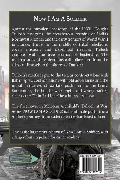 Against the turbulent backdrop of the 1930s, Douglas Tulloch navigates the treacherous terrains of India's Northwest Frontier and the early tremors of World War II in France. Thrust in the middle of tribal rebellions, covert missions and old-school rivalries, Tulloch grapples with the true essence of leadership. The repercussions of his decisions will follow him from the alleys of Brussels to the shores of Dunkirk. Tulloch's mettle is put to the test, as confrontations with Italian spies, confrontations with old adversaries and the moral intricacies of warfare push him to the brink. Sometimes, the line between right and wrong isn't as clear as the "Thin Red Line" he admired as a boy. The first novel in Malcolm Archibald's 'Tulloch at War' series, NOW I AM A SOLDIER is an intimate portrait of a soldier's journey, from cadet to battle-hardened officer. This is the large print edition of Now I Am A Soldier, with a larger font / typeface for easier reading.