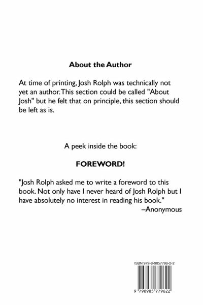 An absurdist take on writing a book, first time author Josh Rolph lays out in humorous, self-deprecating form, a sit-down comedian's dream of writing so many words that he can declare to the world he is an author. The book is an exaggerated memoir and self-help parody on book writing. It exposes how his desperation to become an author far exceeds his desire to write a book, yet after an impossibly long stretch of time making and breaking all self-imposed rules, he manages to get the job done. In a familiar, conversational style, the book showcases everything from the joys of writing a preface - at great length in the preface itself - to the travails of upping the word count. Woven throughout is a collection of "filler" material with essays ranging from yogurt to pants, adapted from his obscure blog and podcast. Two subsequent volumes will continue to follow the story of becoming an author of books (vol. 2) and a multi-volume series (vol. 3). The work follows wannabe author Josh Rolph who hopes to type enough words to produce a book so he can carry the "author" title for the rest of his life. "Just like becoming a mother," Rolph authoritatively declares, "once an author, always an author." "The author credential can only be taken away if it's proved that you plagiarized. And believe me, the only thing plagiarized in this book is chapters four through twenty-one." "Now I Can Say I'm an Author" proves that literally anyone can write a book.