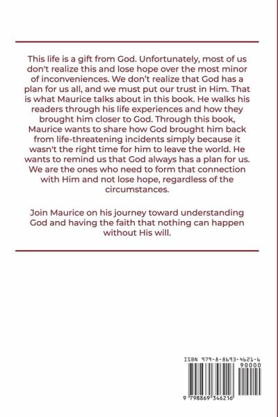 This life is a gift from God. Unfortunately, most of us don't realize this and lose hope over the most minor of inconveniences. We don't realize that God has a plan for us all, and we must put our trust in Him. That is what Maurice talks about in this book. He walks his readers through his life experiences and how they brought him closer to God. Through this book, Maurice wants to share how God brought him back from life-threatening incidents simply because it wasn't the right time for him to leave the world. He wants to remind us that God always has a plan for us. We are the ones who need to form that connection with Him and not lose hope, regardless of the circumstances. Join Maurice on his journey toward understanding God and having the faith that nothing can happen without His will.