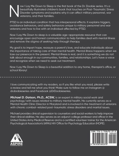 Now I Lay Me Down to Sleep is the first book of the Dr. Doobie series. It's a beautifully illustrated children's book that touches on Post-Traumatic Stress Disorder symptoms and explains why it can affect military personnel, war veterans, and their families. PTSD is an individual condition that has interpersonal effects. It explains triggers, avoidance behaviors, and safety behaviors unique to military personnel and war veterans and how to live with an individual affected by PTSD. Now I Lay Me Down to sleep is a valuable age-appropriate resource that can encourage open and honest communication to help families deal with mental illness and remove the stigma of seeking help through therapy. My goal is to impart hope, reassure a parent's love, and educate individuals about the importance of taking care of their mental health. Mental illness happens when we lose our presence in the present. Mental illness is real, and it is something we do not talk about enough in our communities, families, and relationships. Let's have a voice and recognize when we need to seek out treatment. Now I Lay Me Down to Sleep is a beautiful addition to any home, therapist's office, or school library! I love communicating with my readers, so if you like what you read, please write a review and tell me what you think! Make sure to follow me on Instagram @dr.doobieseries and Facebook @DrDoobieseries. Michael D. Gatson, Ph.D., ACSW, is an expert in military social work and psychology/with issues related to military mental health. He currently serves as a Mental Health Clinic Director in Maryland and is involved in the treatment of veterans with chronic combat-related post-traumatic stress disorders and marital issues. Michael provides clinical supervision to counselors and social workers to help improve their clinical abilities. He also serves as an adjunct college professor and officer in the United States Army Medical Reserve and is a certified volunteer trainer for the American Psychological Association's (APA's) HIV Office for Psychology Education (HOPE).