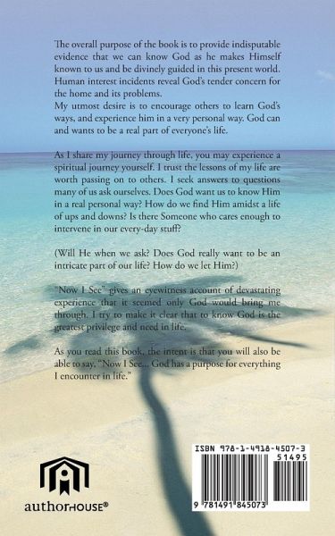 The overall purpose of the book is to provide indisputable evidence that we can know God as he makes Himself known to us and be divinely guided in this present world. Human interest incidents reveal God's tender concern for the home and its problems. My utmost desire is to encourage others to learn God's ways, and experience him in a very personal way. God can and wants to be a real part of everyone's life. As I share my journey through life, you may experience a spiritual journey yourself. I trust the lessons of my life are worth passing on to others. I seek answers to questions many of us ask ourselves. Does God want us to know Him in a real personal way? How do we find Him amidst a life of ups and downs? Is there Someone who cares enough to intervene in our every-day stuff? (Will He when we ask? Does God really want to be an intricate part of our life? How do we let Him?) "Now I See" gives an eyewitness account of devastating experience that it seemed only God would bring me through. I try to make it clear that to know God is the greatest privilege and need in life. As you read this book, the intent is that you will also be able to say, "Now I See... God has a purpose for everything I encounter in life."