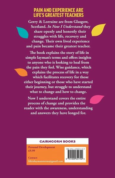 Pain and Experience are life's greatest teachers Gerry & Lorraine are from Glasgow, Scotland. In Now I Understand they share openly and honestly their struggles with life, recovery and change. Their own lived experience and pain became their greatest teacher. The book explains the story of life in simple layman's terms and offers insights to anyone who is looking to heal from the pain they feel. Wise guidance, which explains the process of life in a way which facilitates recovery for those either beginning or those who have started their journey, but struggle to understand what to change and how to change. Now I understand covers the entire process of change and provides the reader with the awareness, understanding and answers they have longed for.