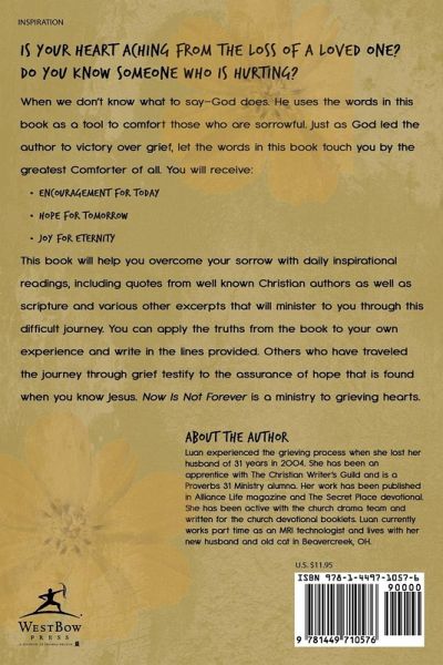 Is your heart aching from the loss of a loved one? Do you know someone who is hurting? When we don't know what to say-God does. He uses the words in this book as a tool to comfort those who are sorrowful. Just as God led the author to victory over grief, let the words in this book touch you by the greatest Comforter of all. You will receive: ¿ Encouragement for today ¿ Hope for tomorrow ¿ Joy for eternity This book will help you overcome your sorrow with daily inspirational readings, including quotes from well known Christian authors as well as scripture and various other excerpts that will minister to you through this difficult journey. You can apply the truths from the book to your own experience and write in the lines provided. Others who have traveled the journey through grief testify to the assurance of hope that is found when you know Jesus. Now Is Not Forever is a ministry for grieving hearts.