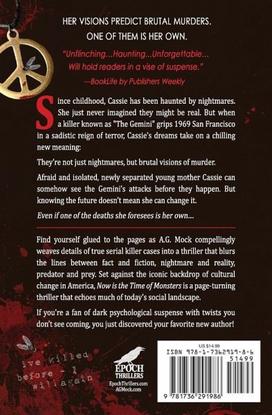 Three visions of death. Two women trapped in a killer's lair. One chance to survive. The Summer of Love has been replaced by the Summer of Fear as a sadistic killer prowls the streets of San Francisco. Known only as 'The Gemini,' his brutal murders have the city paralyzed in a merciless grip of terror as he taunts police with a series of cryptic puzzles and the body count rises. As detectives work to unravel the Gemini's chilling clues, the line between nightmare and reality begins to blur when Cassie Kennedy-a newly separated young mother and part-time psychic-discovers that her dreams are foretelling the gruesome deaths of three women. Thrust into the heart of the investigation, it becomes a desperate fight for survival when the horrifying truth emerges: Cassie may know the Gemini more intimately than she ever imagined... Set against the gritty backdrop of 1969 San Francisco, Now is the Time of Monsters is a pulse-pounding thriller that blurs the razor-thin line between predator and prey, fact and fiction. For fans of dark, gripping suspense-you're one click away from a thrill ride you'll never forget!