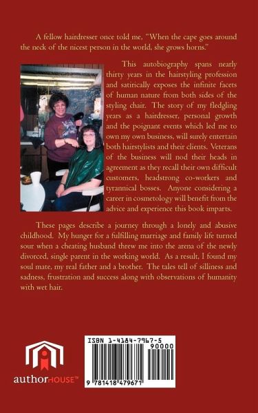 A fellow hairdresser once told me, "When the cape goes around the neck of the nicest person in the world, she grows horns." This autobiography spans nearly thirty years in the hairstyling profession and satirically exposes the infinite facets of human nature from both sides of the styling chair. The story of my fledgling years as a hairdresser, personal growth and the poignant events which led me to own my own business, will surely entertain both hairstylist and their clients. Veterans of the business will nod their heads in agreement as they recall their own difficult customers, headstrong co-workers and tyrannical bosses. Anyone considering a career in cosmetology will benefit from the advice and experience this book imparts. These pages describe a journey through a lonely and abusive childhood. My hunger for a fulfilling marriage and family life turned sour when a cheating husband threw me into the arena of the newly divorced, single parent in the working world. As a result, I found my soul mate, my real father and a brother. The tales tell of silliness and sadness, frustration and success along with observations of humanity with wet hair.