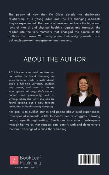 The poetry of Now that I'm Older details the challenging relationship of a young adult and the life-changing moments they've experienced. The poems witness and embody the highs and lows of mental and physical health struggles and transport the reader into the very moments that changed the course of the author's life forever. With every poem, their weighty words foster acknowledgement, acceptance, and recovery.
