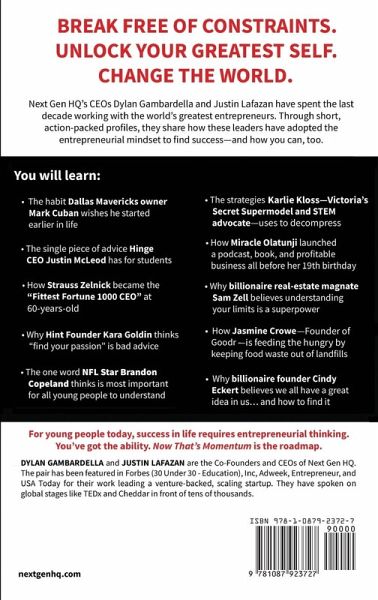 BREAK FREE OF CONSTRAINTS. UNLOCK YOUR GREATEST SELF. CHANGE THE WORLD. Uncover the mindsets, strategies, and skills of 50+ successful business leaders and world-class performers, including Fortune 500 CEOs, professional athletes, billion-dollar startup founders, best-selling authors, social visionaries, celebrities, and future change-makers. Explore authentically rare stories that illustrate how entrepreneurial thinking guided these innovators on their journeys. All of the features are chosen by co-authors Dylan Gambardella and Justin Lafazan, who have spent the last decade working with the world's greatest entrepreneurs. Through short, action-packed profiles, they share how these leaders have adopted the entrepreneurial mindset to find success - and how you can, too. Now That's Momentum shares the framework to help cultivate an entrepreneurial mindset and develop your best self. Whether you're starting a business, finding a purpose-driven career, becoming an artist, seeking a promotion, or running for a leadership position, the tactics and stories shared in Now That's Momentum will make the entrepreneurial mindset accessible to all and supercharge your journey. Now That's Momentum outlines the strategies and secrets leaders use to find success along their unique paths. Some things you'll discover:Which entrepreneur does Mark Cuban most admire? Cuban is the billionaire owner of the Dallas Mavericks and a judge on ABC's Shark Tank. How does Karlie Kloss - Victoria's Secret Supermodel, STEM advocate, and new mom - achieve work-life balance? When does Strauss Zelnick, dubbed "America's Fittest CEO," feel his best? How did Cindy Eckert, who sold the rights to the "Female Viagra" for $1 billion, get the drug back for free? What motivates NFL Star Brandon Copeland to teach finance at an Ivy League university? How is Jasmine Crowe - Founder of Goodr - feeding the hungry and keeping food waste out of landfills? Why didn't Jimmy, Jake, and Jordan DeCicco - Founders of Super Coffee, now valued above $500MM - give up after being turned down by the judges on Shark Tank? For young people today, success in life requires entrepreneurial thinking. You've got the ability. Now That's Momentum is the roadmap.