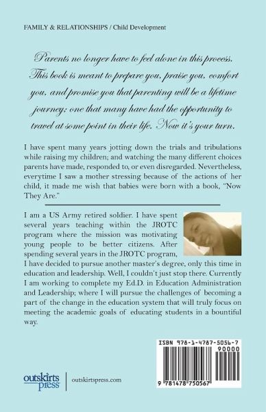 Parents no longer have to feel alone in this process. This book is meant to prepare you, praise you, comfort you, and promise you that parenting will be a lifetime journey; one that many have had the opportunity to travel at some point in their life. Now it’s your turn. I have spent many years jotting down the trials and tribulations while raising my children; and watching the many different choices parents have made, responded to, or even disregarded. Nevertheless, every time I saw a mother stressing because of the actions of her child, it made me wish that babies were born with a book, "Now They Are."