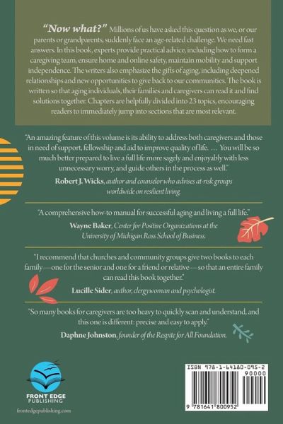 "Now what?" Millions of us ask this question as we, or our parents or grandparents, suddenly face an age-related challenge. We need fast answers. In this book, experts provide practical advice, including how to form a caregiving team, ensure home and online safety, maintain mobility and support independence. The writers also emphasize the gifts of aging, including deepened relationships and new opportunities to give back to our communities. The book is written so that aging individuals, their families and caregivers can read it and find solutions together. "An amazing feature of this volume is its ability to address both caregivers and those in need of support, fellowship and aid to improve quality of life," Robert J. Wicks, the author of many books about resilience, writes about this new book. "You will be so much better prepared to live a full life more sagely and enjoyably with less unnecessary worry, and guide others in the process as well." Lucille Sider, author and psychologist, urges "churches and community groups to give two books to each family, one for the senior and one for a friend or relative, so that an entire family can read this book together." Chapters are helpfully divided into 23 topics, encouraging readers to immediately jump into sections that are most relevant. This is "a comprehensive how-to manual for successful aging and living a full life," writes Wayne Baker of the Center for Positive Organizations at the University of Michigan Ross School of Business. Among the 23 chapters are: ¿ You Are Not Alone: Connecting in healthy ways with our community ¿ Our Allies: Organizing a successful team ¿ Our Gifts: All of us have strengths that give our lives meaning ¿ Our Service: Using our unique talents to create meaningful change ¿ Saging, Not Aging: A transcultural perspective on our gifts as we age ¿ Going Online: Safety connecting with friends and family on social media ¿ Caring for Our Caregivers: More than 50 million Americans devote their lives to our care ¿ Connecting with a Congregation: Joining a congregation is a healthy step ¿ Mobility Matters! Should we stop driving? And, if we do, what now? ¿ Home Safe Home: Making sure "home" equals "healthy" ¿ Emergency Preparedness: A 10-point safety list to help you sleep soundly ¿ Don't Throw that Away! Downsizing and the challenges of hoarding ¿ Hidden Challenges and Helplines: Identifying easily overlooked issues before they become crises ¿ A Trip to the Doctor: Plan ahead to make the most of your healthcare team ¿ Directing Our Care: Advance directives, power of attorney, living wills and DNRs ¿ Enjoying Life: Having fun is healthy! ¿ What Is Hospice Care? Finding comfort and peace at the end of life ¿This book was created through efforts of the Agencies United for Healthy Aging collaborative.