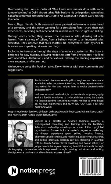 Overhearing the unusual order of "One karak rava masala dosa with some tomato ketchup" at Delhi airport takes Rishi back to his college days, reminding him of his eccentric classmate Guru. Not to his surprise, it is indeed Guru placing the order. Two college friends, both seasoned sales professionals-one a sales head of a company and the other working for a consulting firm-share their rich experiences, enriching each other and the readers with their insights on selling. Through each chapter, they uncover the nuances of sales, drawing valuable lessons from a variety of sellers, from a balloon vendor to an industrial sales executive. They observe that sales masters are everywhere, from bylanes to boardrooms, imparting priceless teachings. Each chapter takes you through the steps of sales in a story format. The book is designed for easy reading, allowing readers to start from any chapter. It is filled with anecdotes, illustrations, and caricatures, making the reading experience more engaging and interesting. We hope you enjoy this book on sales. Do write to us with your comments and suggestions.