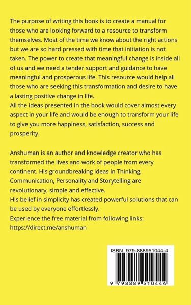 The purpose of writing this book is to create a manual for those who are looking forward to a resource to transform themselves. Most of the time we know about the right actions but we are so hard pressed with time that initiation is not taken. The power to create that meaningful change is inside all of us and we need a tender support and guidance to have meaningful and prosperous life. This resource would help all those who are seeking this transformation and desire to have a lasting positive change in life. All ideas presented in this work will not have equal effect on all readers; some ideas may work well on some individuals in comparison to others, certain ideas may not be applicable for few readers who may redesign it in their own context. A complete sincerity towards this transformation process would be the most important tool to gain the true benefits of this journey. The ideas are simple and most of them would be known to readers, but somehow they were not implemented in their life for one reason or other. Readers can implement it according to the ways specified in the book or design their own methods, the purpose is to experience the power of the idea and try to make it a part of your life. All these ideas would cover almost every aspect in your life and would be enough to transform your life to give you more happiness, satisfaction, success and prosperity.