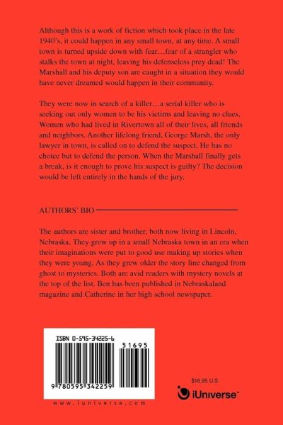 Although this is a work of fiction which took place in the late 1940's, it could happen in any small town, at any time. A small town is turned upside down with fear...fear of a strangler who stalks the town at night, leaving his defenseless prey dead! The Marshall and his deputy son are caught in a situation they would have never dreamed would happen in their community. They were now in search of a killer...a serial killer who is seeking out only women to be his victims and leaving no clues. Women who had lived in Rivertown all of their lives, all friends and neighbors. Another lifelong friend, George Marsh, the only lawyer in town, is called on to defend the suspect. He has no choice but to defend the person. When the Marshall finally gets a break, is it enough to prove his suspect is guilty? The decision would be left entirely in the hands of the jury.