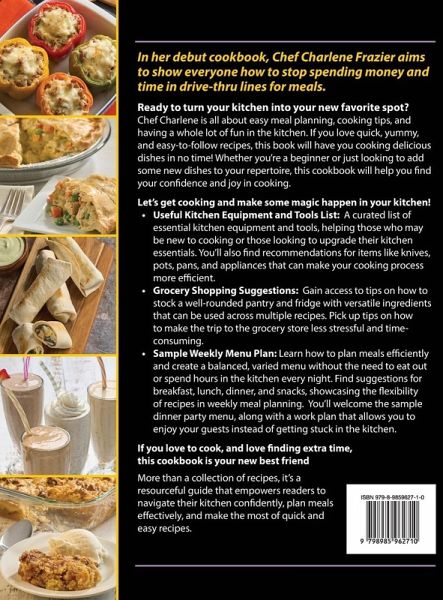 In her debut cookbook, Chef Charlene Frazier aims to show everyone how to stop spending money and time in drive-thru lines for meals. Ready to turn your kitchen into your new favorite spot? Chef Charlene is all about easy meal planning, cooking tips, and having a whole lot of fun in the kitchen. If you love quick, yummy, and easy-to-follow recipes, this book will have you cooking delicious dishes in no time! Whether you're a beginner or just looking to add some new dishes to your repertoire, this cookbook will help you find your confidence and joy in cooking. Let's get cooking and make some magic happen in your kitchen! Useful Kitchen Equipment and Tools List: A curated list of essential kitchen equipment and tools, helping those who may be new to cooking or those looking to upgrade their kitchen essentials. You'll also find recommendations for items like knives, pots, pans, and appliances that can make your cooking process more efficient. Grocery Shopping Suggestions: Gain access to tips on how to stock a well-rounded pantry and fridge with versatile ingredients that can be used across multiple recipes. Pick up tips on how to make the trip to the grocery store less stressful and time-consuming. Sample Weekly Menu Plan: Learn how to plan meals efficiently and create a balanced, varied menu without the need to eat out or spend hours in the kitchen every night. Find suggestions for breakfast, lunch, dinner, and snacks, showcasing the flexibility of recipes in weekly meal planning. You'll welcome the sample dinner party menu, along with a work plan that allows you to enjoy your guests instead of getting stuck in the kitchen. If you love to cook, and love finding extra time, this cookbook is your new best friend More than a collection of recipes, it's a resourceful guide that empowers readers to navigate their kitchen confidently, plan meals effectively, and make the most of quick and easy recipes.