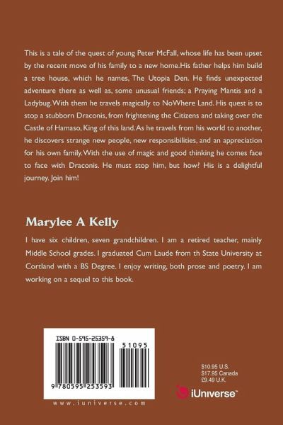 This is a tale of the quest of young Peter Mcfall, whose life has been upset by the recent move of his family to a new home.His father helps him build a tree house, which he names, The Utopia Den. He finds unexpected adventure there as well as, some unusual friends; a Praying Mantis and a Ladybug. With them he travels magically to NoWhere Land. His quest is to stop a stubborn Draconis, from frightening the Citizens and taking over the Castle of Hamaso, King of this land. As he travels from his world to another, he discovers strange new people, new responsibilities, and an appreciation for his own family. With the use of magic and good thinking he comes face to face with Draconis. He must stop him, but how? His is a delightful journey. Join him!