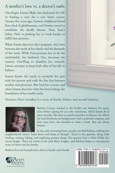 A mother's love vs. a doctor's oath. Oncologist Emma Blake has dedicated her life to finding a cure for a rare brain cancer. Twenty-five years ago, Emma's childhood friend Kate died of glioblastoma, and Emma vowed to annihilate the deadly disease. Now, Kate's father, Ned, is pushing her to work harder to fulfill that promise. When Emma discovers she's pregnant, she's torn between the needs of her family and the demands of her work. While Ned pressures her to do the unthinkable, her husband, Tim, decorates the nursery. Unwilling to abandon her research, Emma attempts to keep both sides of her life in balance. Emma knows she needs to reconcile her past with her present and walk the fine line between mother and physician. But Ned has a secret, and when Emma discovers what he's been hiding, the foundation of her world cracks. Nowhere Near Goodbye is a story of family, failure, and second chances.
