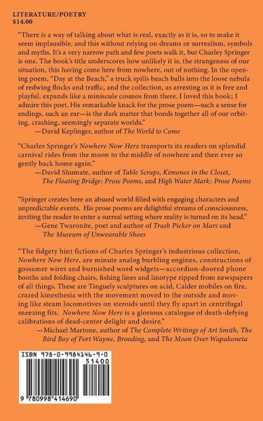 Nowhere Now Here by Charles Springer is a collection of prose poems that read and feel whimsical on the surface, with solid and brilliant imagery, but underneath this surface readers will be moved by undercurrents of grit and pathos. It's a stand-out collection of ordinary lives and their seemingly ordinary moments made extraordinary. "Charles Springer's Nowhere Now Here transports its readers on splendid carnival rides from the moon to the middle of nowhere and then ever so gently back home again." - David Shumate, author of Table Scraps, Kimonos in the Closet, The Floating Bridge: Prose Poems and High Water Mark: Prose Poems "Imagine Max Jacob's Dice Cup made love with Charles Simic's Not The End of the World made love with Amy Gerstler's Bitter Angel and then throw in some Jennifer L. Knox for fun. You are holding in your hands the offspring of this amalgamation of voices and tones and spirits. Except Charley Springer's collection of prose poems, Nowhere Now Here, is its own Technicolor vision of the world and the heart. This book is a remarkable and singular thing unto itself. These prose poems are wild, wise, funny, and finger lickin' good. You just want more. You just want to lick the sweet and sour of his trope off of your fingers so you can get all the flavor of his voice into your body and heart as deeply as possible. These poems make you want to last with them long into the nighttime because you know that Springer is the best spy, the best farmer, the best friend, the best person to dial the operator. These prose poems are the best prose poems and Nowhere Now Here is everywhere one time and always here right now, forever." - Matthew Lippman, author of Mesmerizingly Sadly Beautiful