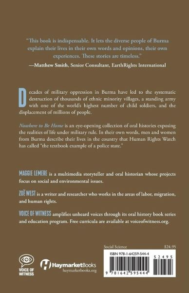 Nowhere to Be Home is an eye-opening collection of oral histories exposing the realities of life under military rule. In their own words, men and women from Burma describe their lives in the country that Human Rights Watch has called "the textbook example of a police state."