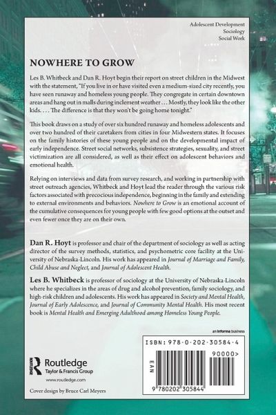 Les B. Whitbeck and Dan R. Hoyt begin their report on street children in the Midwest with the statement, "If you live in or have visited even a medium-sized city recently, you have seen runaway and homeless young people. They congregate in certain downtown areas and hang out in malls during inclement weather . . . Mostly, they look like the other kids. . . . The difference is that they won't be going home tonight." This book draws on a study of over six hundred runaway and homeless adolescents and over two hundred of their caretakers from cities in four Midwestern states. It focuses on the family histories of these young people and on the developmental impact of early independence. Street social networks, subsistence strategies, sexuality, and street victimization are all considered, as well as their effect on adolescent behaviors and emotional health. Relying on interviews and data from survey research, and working in partnership with street outreach agencies, Whitbeck and Hoyt lead the reader through the various risk factors associated with precocious independence, beginning in the family and extending to external environments and behaviors. Nowhere to Grow is an emotional account of the cumulative consequences for young people with few good options at the outset and even fewer once they are on their own.