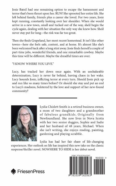 Lydia Chislett Smith is a retired business owner, a mom of two daughters and a grandmother of fabulous grandkids. Originally from Newfoundland. She now lives in Nova Scotia with her two senior doggies, Sophie and Sadie and her husband of 48 years, Michael. When she isn't writing, she enjoys reading, painting, gardening and playing scrabble. Lydia has had her fair share of life-changing experiences. Her outlook on life has inspired this new take on the classic suspense/thriller novel. NOWHERE TO HIDE is her debut novel.
