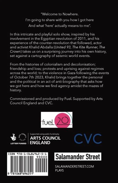 Khalid Abdalla is an actor, producer, writer and filmmaker. Nowhere is his first play. He is known most notably for his performances in The Crown as Dodi Fayed, Marc Forster’s The Kite Runner, and in the Paul Greengrass features United 93 and Green Zone. He produced and starred in the Egyptian feature In the Last Days of the City, directed by Tamer El Said, and in Tala Hadid’s The Narrow Frame of Midnight, and appears in Jehane Noujaim’s Oscar-nominated documentary about the 2011 Egyptian revolution The Square. His next role was in a remake of The Day of the Jackal; and he performed in Mnemonic with Theatre de Complicité at The National Theatre. Khalid is a founding member of three cultural initiatives in Cairo—Cimatheque, Zero Production and Mosireen. He is also an Honorary Fellow of Queens’ College Cambridge. Brought up in the UK to Egyptian parents, Cairo and London are his two cities.