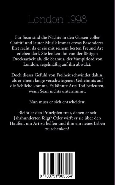 London 1998Für Sean sind die Nächte in den Gassen voller Graffiti und lauter Musik immer etwas Besonderes. Erst recht, da er sie mit seinem besten Freund Art erleben darf. Sie lenken ihn von der lästigen Drecksarbeit ab, die Seamus, der Vampirlord von London, regelmässig auf ihn abwälzt. Doch dieses Gefühl von Freiheit schwindet dahin, als er einem lange verschwiegenen Geheimnis auf die Schliche kommt. Es könnte Arts Tod bedeuten, wenn Sean nichts unternimmt.Nun muss er sich entscheiden:Bleibt er den Prinzipien treu, denen er seit Jahrhunderten folgt? Oder wirft er sie über den Haufen, um Art zu helfen und ihm ein neues Leben zu schenken?Mit Illustrationen von LucifersChoice